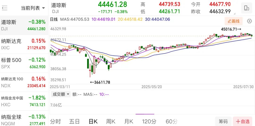 美联储主席鲍威尔在发布会上表示,尚未就是否在9月调整政策作出决定。这一表态压制了降息预期,美股回落。标普500指数在盘中一度上涨0.4%,最终转跌0.12%,收于6362.90点;道琼斯工业平均指数下跌171.71点,跌幅0.38%,收于44461.28点;纳斯达克综合指数逆势微涨0.15%,收于21129.67点。